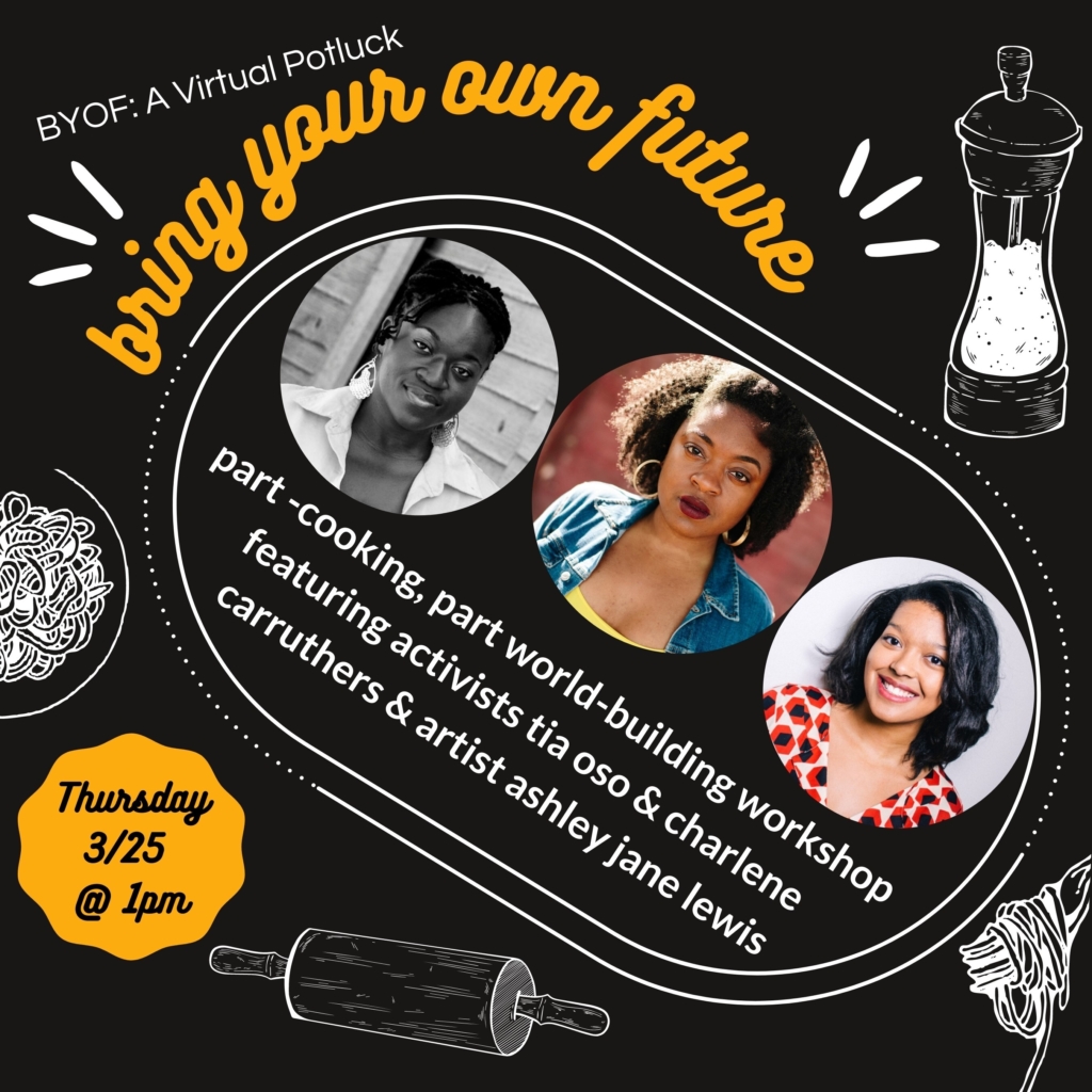 us dream of healthier futures and heal our past? Part-cooking class, part-world-building, join activists Charlene Carruthers and Tia Oso and artist Ashley Jane Lewis in this event to unlock new futures through food (and eating) inspired by the Black diaspora. Curated by Intelligent Mischief.