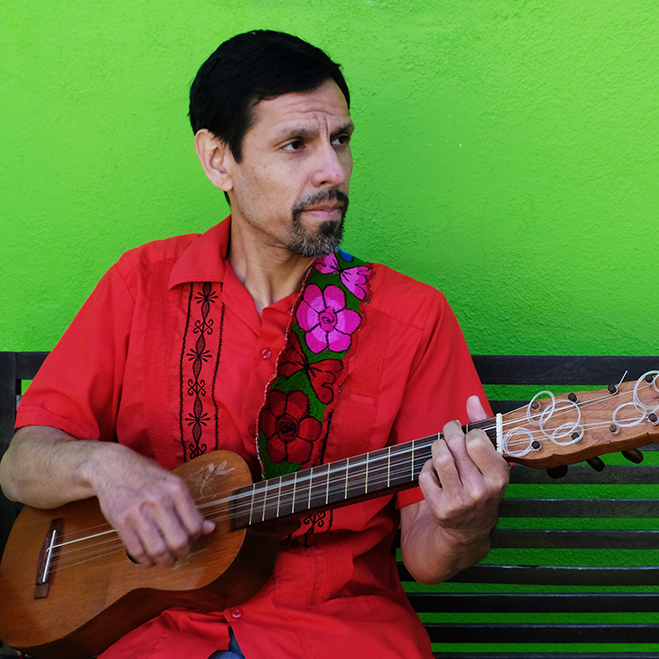 Quetzal Flores is a Chican@ musician, producer and cultural strategist/organizer raised in East Los Angeles. He is the founder and musical director of the Grammy Award winning Chican@ band, Quetzal. From the experiences generated through his family, mentors and the Chican@ arts&cultural community he has participated in multiple moments of radical transformation. In 1997 he co-organized the historic Encuentro Cultural Chican@/Indigena Por La Humanidad en Contra del Neoliberalismo, a week long dialogue/retreat in the mountains of Chiapas, Mexico. The Encuentro gathered 100 arts&culture practitioners from East Los Angeles and Mayan Zapatistas that developed multiple outward facing emancipatory cultural methodologies with tangible touchdowns into community practice. In 2000 Quetzal was part of a group of artists from East LA who built important transnational and trans local relationships with fandango communities in Veracruz. Through these relationships an important network was formed that has given way to a current thriving national system of fandango practitioners in the US. In 2009 Quetzal co-founded the Seattle Fandango Project (SFP), a participatory music and dance community instrumental in providing an intergenerational space for people of color throughout Seattle. In 2012, he co-founded FandangObon, a yearly event that brings Los Angeles Chican@, Japanese and African American communities together around participatory music and dance practices. Since 2012 Quetzal has served as a Program Manager for the Alliance for California Traditional Arts (ACTA) designing and implementing culturally sustainable health equity work in Boyle Heights as well as in prisons across the state. As a producer, Quetzal has contributed over 100 recordings with artists such as; Son de Madera, Jose Luis Orozco, Nobuko Miyamoto, B-Side Players, Alice Bag, Maya Jupiter, Aloe Blacc and Susana Baca. From 2013 to 2019 he served as a board member for the Smithsonian Folkways Recorders. From 2016 to 2020 he worked as the Director of Cultural Vitality for the East LA Community Corporation. Currently, Quetzal is the co-founder and Director of Membership and Wellness for the Community Power Collective(CPC), overseeing internal and external facing cultural processes to build power with low-income tenants and workers through transformative, cross-sectoral organizing.