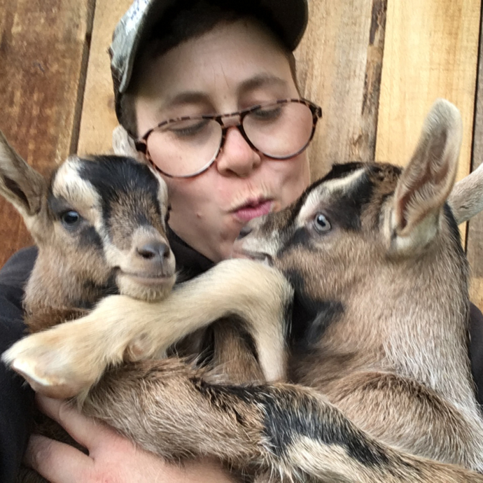 Rae Garringer holding and kissing baby goats